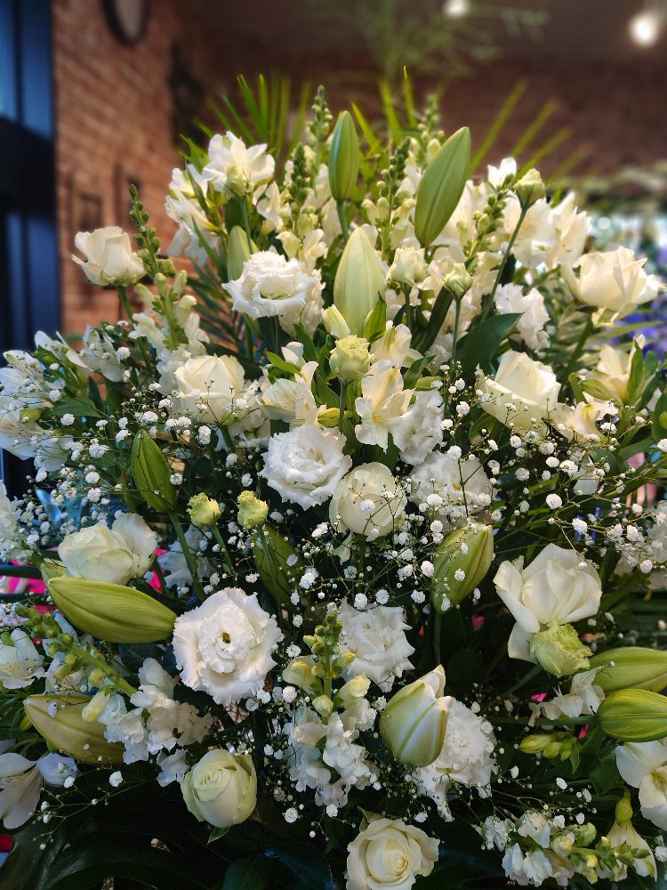 スタンド花お祝い開店用 お供え用 洋花の白系ナチュラルなフラワースタンド上1段【浜松市 / 磐田市 / 湖西市への配送限定】
