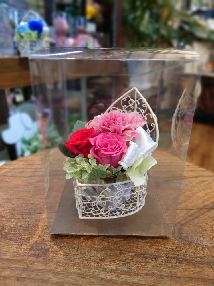 プリザーブドフラワーのカーネーションを使いハートの器にアレンジメント 赤色系、黄色系、青色系と選べれます。