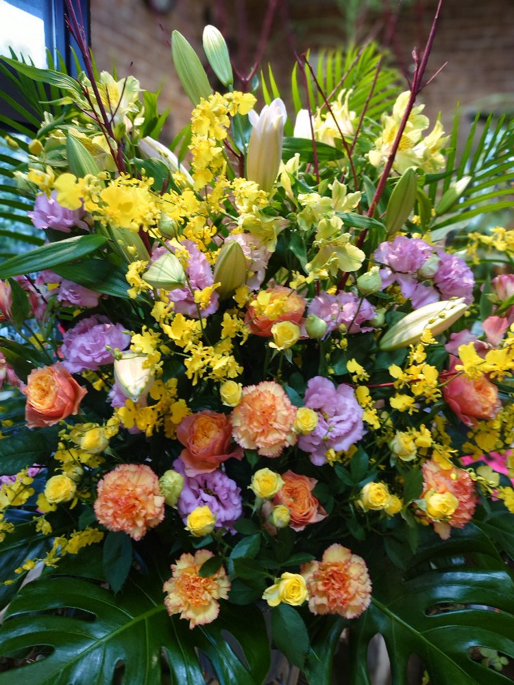 御祝い・開店スタンド花【イエローオレンジ系】上1段フラワースタンド。