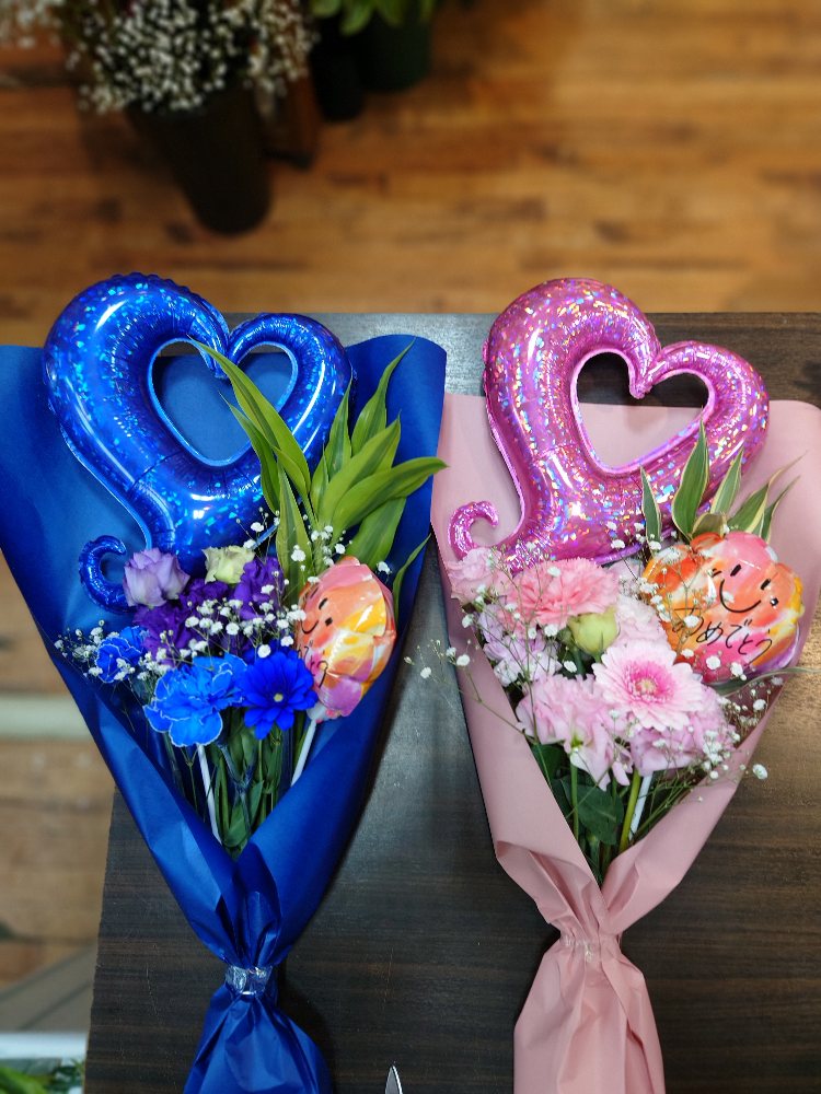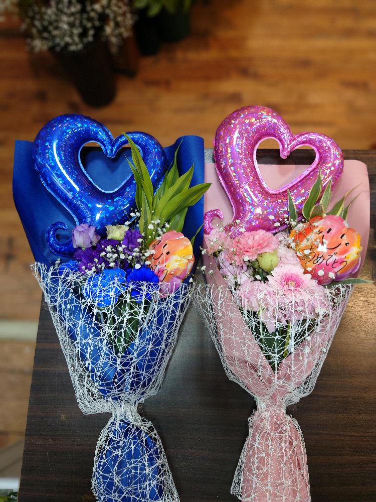 ハートバルーンとおめでとうバルーンを使っての花束になります。