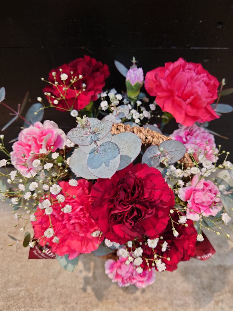 カスミ草と、赤・ピンク系のカーネーションを使ってバスケットにアレンジメントしました。