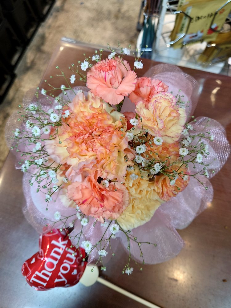 カスミ草と、黄色・オレンジ系のカーネーションを簡易花瓶を使ってブーケ仕立てにしました。